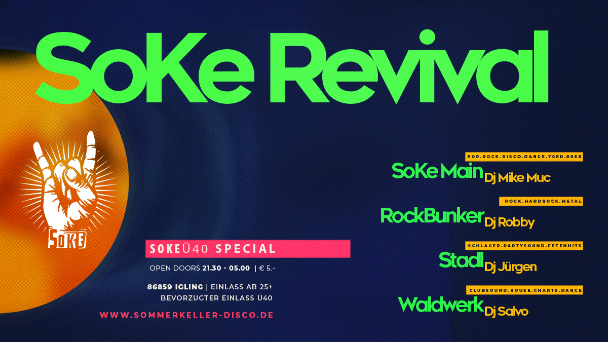 Sommerkeller Disco Am Sommerkeller 1, Igling, Bayern, DeutschlandDie große SoKe Revival Night • Mit den DJs von damals, der Stimmung von damals, der Musik von damals und den Gästen von damals .... SAMSTAG, 21.03.2026 SoKe Revival Night - Ü40 Party Einlass ab 21.30 Uhr Special Einlass für…