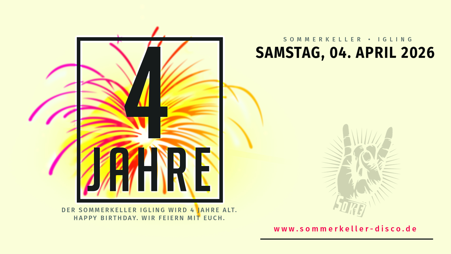 Sommerkeller Disco Am Sommerkeller 1, Igling, Bayern, DeutschlandDie große SoKe Birthday Night. 4 Jahre Sommerkeller. FOREVER YOUNG SAMSTAG, 04.04.2026 SoKe Birthday Night - 4 Jahre Sommerkeller 👉 SoKe Hauptraum: Pop, Rock, Disco, Dance, 70er, 80er, 90er: DJ RAMAZOTTL 👉 Stadl: Partysound, Schlager, Fetenhits, Ballermann, Apres-Ski: DJ BUDDY…